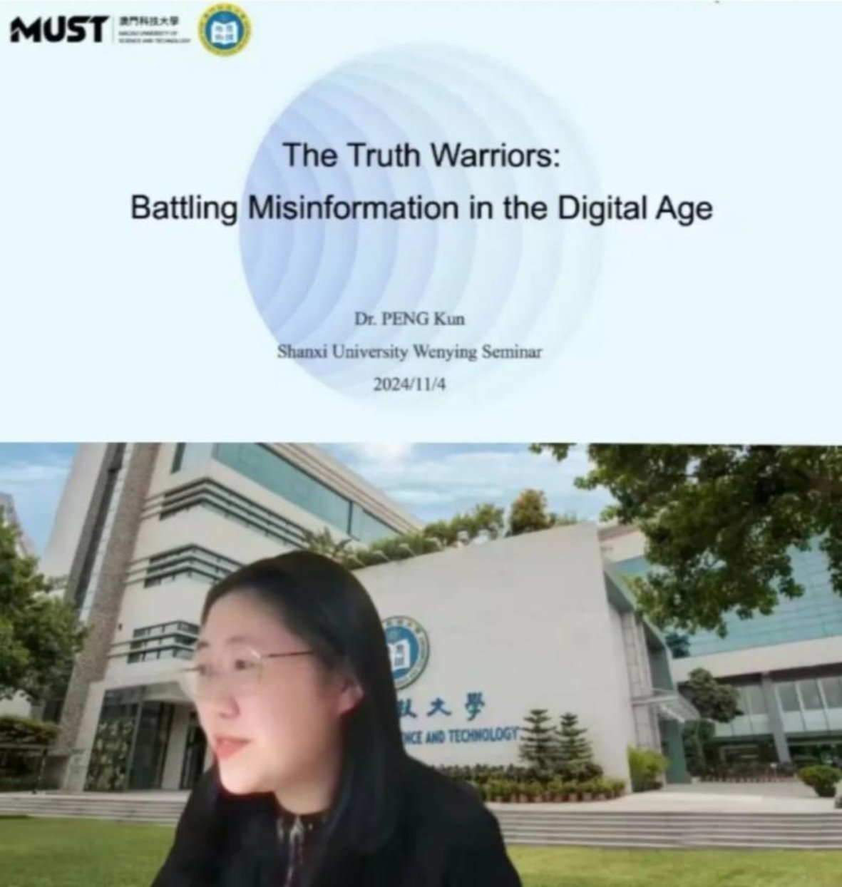 11月4日,澳门科技大学人文艺术学院助理教授、博士生导师、山西大学校友彭堃,受邀为我院带来了主题为“The Truth Warriors: Battling Misinformation in the Digital Age ”的精彩讲座。讲座由新闻学院副院长梁红艳主持,新闻学院师生通过线上平台积极参与。