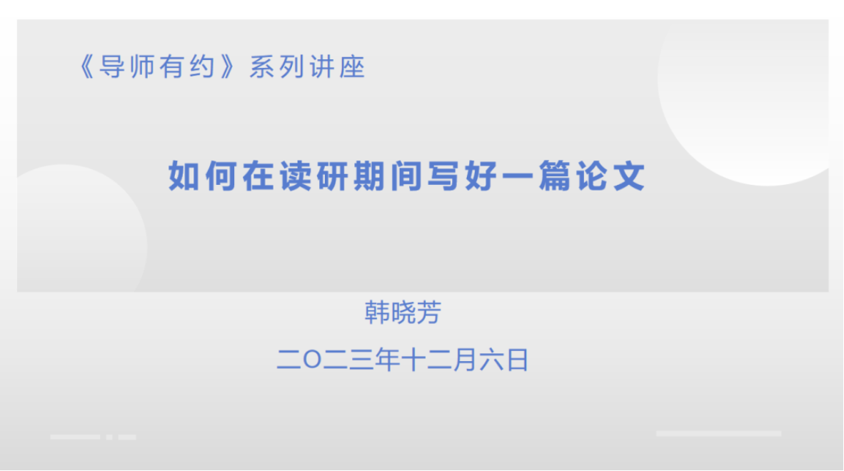 12月6日下午,leyu乐鱼·官方web站登录入口“导师有约”第十三期讲座在商学楼B206如约举行。此次讲座以“如何在读研期间写好一篇论文”为题展开,韩晓芳老师针对论文写作中可能会出现的共性问题,结合自身的学术成长经历,分享了如何培养写作意愿、确定选题、阅读文献等方面的经验,为研究生的学习提供了宝贵的建议。