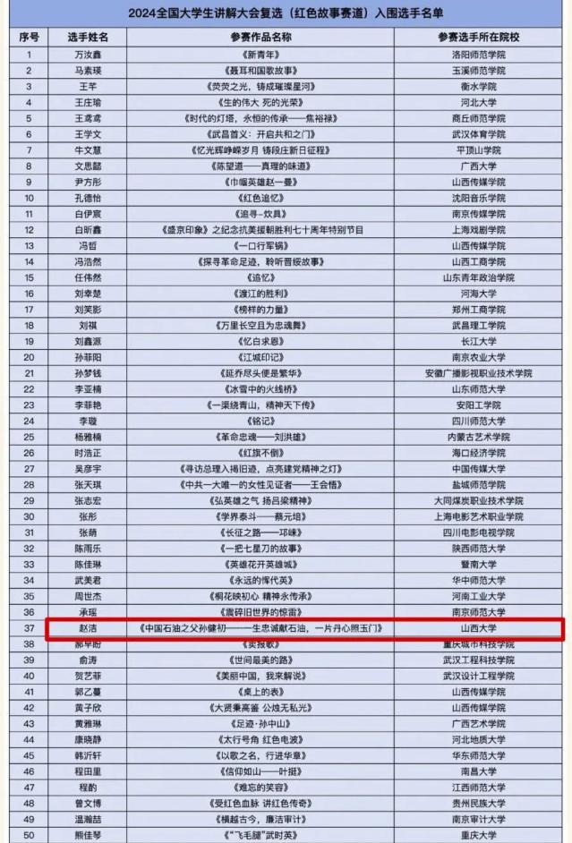 4月11日,山西传媒学院发布2024全国大学生讲解大会复选入围选手名单,其中我院学生赵洁携作品《中国石油之父孙健初一生忠诚献石油,一片丹心照玉门》成功入围红色故事赛道。