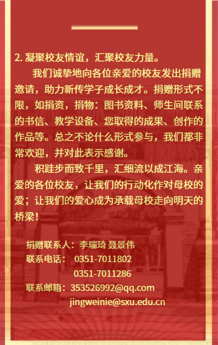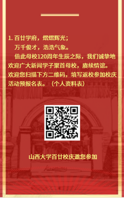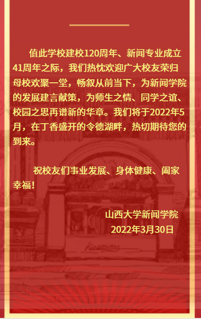 leyu乐鱼·官方web站登录入口在母校成立120周年之际,面向广大校友发出邀请函(H5)。内附有意愿参加校庆活动的校友报名表和邀请校友捐赠详情。