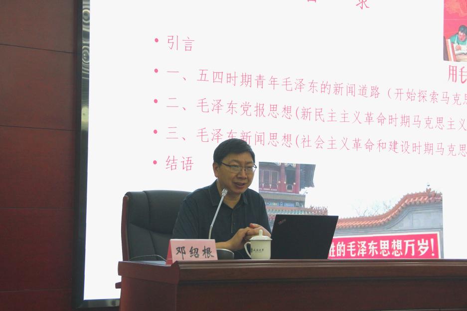 邓绍根教授以少年毛泽东酷爱读书看报为起点,重点讲解五四时期青年毛泽东的新闻道路,接着简要阐述毛泽东在新民主主义革命时期、社会主义革命时期和建设时期的党报思想、新闻思想。