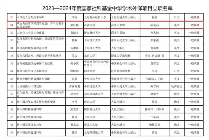 近日,全国哲学社会科学工作办公室对外发布了2023-2024年度国家社科基金中华学术外译项目立项名单,我院梁红艳副教授申报的《从古典经济学派到马克思:若干主要学说发展论略》项目获批立项。