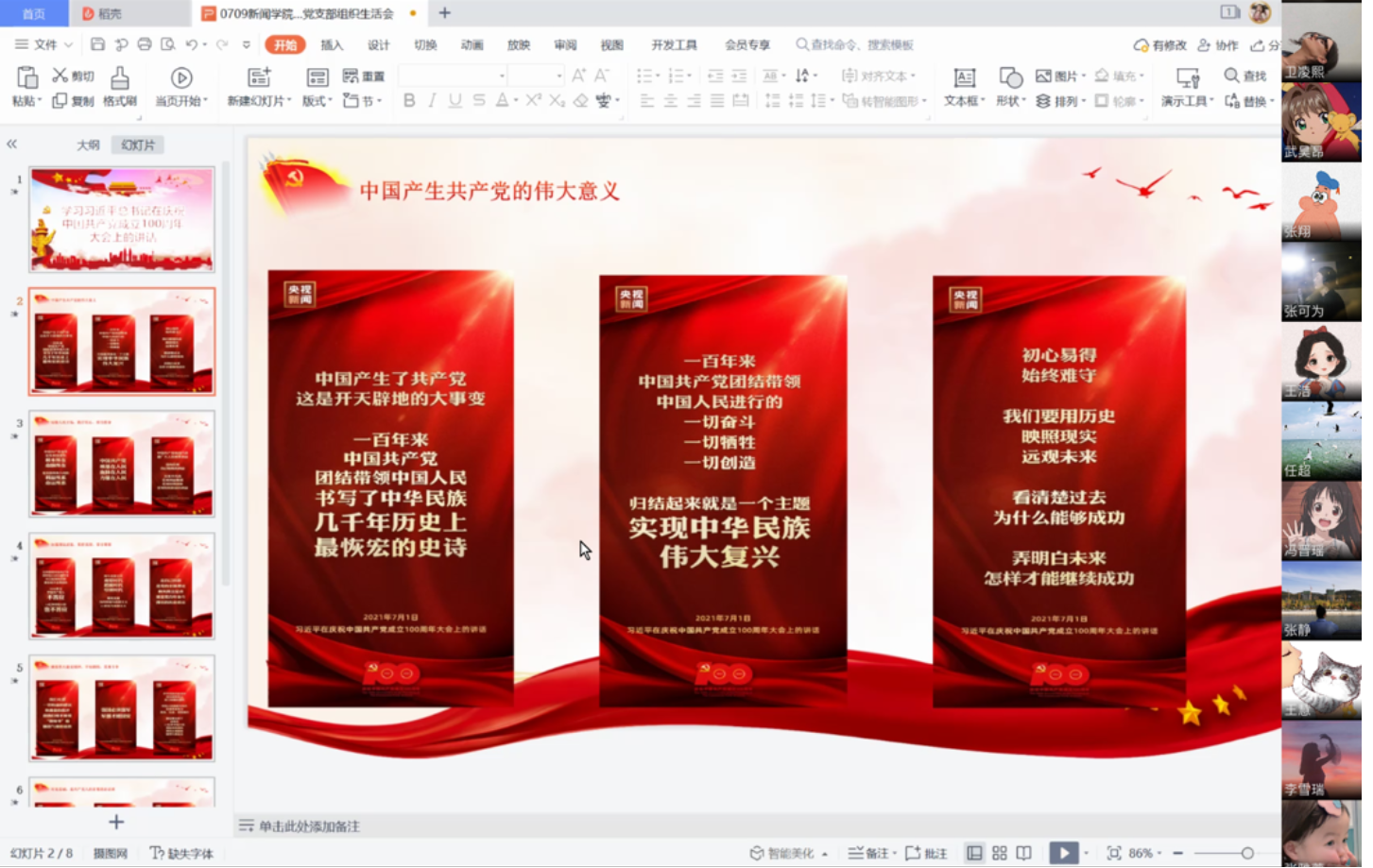 为深入学习贯彻习近平总书记在庆祝中国共产党成立100周年庆祝大会上的重要讲话,进一步夯实“明理、增信、崇德、力行”的思想根基。2021年7月9日晚8点,新闻学院研究生第二党支部通过企业微信,在线上召开了党史学习教育专题组织生活会。按照上级党委的相关要求,与会党员交流党史学习心得体会,查找差距不足,在批评与自我批评中审视与完善自我。会议由支部书记郝强主持,新闻学院党委书记李俊洁受邀参加会议。