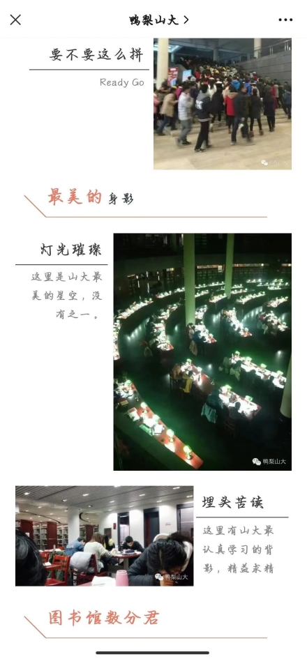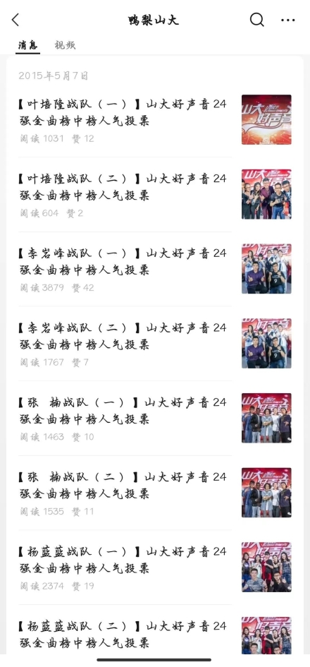 2014年在一个个有趣的每周话题中度过,而到了2015年,这种每周话题的形式渐渐不再采用,而是承办并宣传了一系列活动。如2月的“Different新年系列活动”以及4月份的“山大好声音系列活动”等,鸭梨山大公众号都对其进行了系列跟踪报道,获得了较大的阅读量,也得到了同学们的支持与好评。