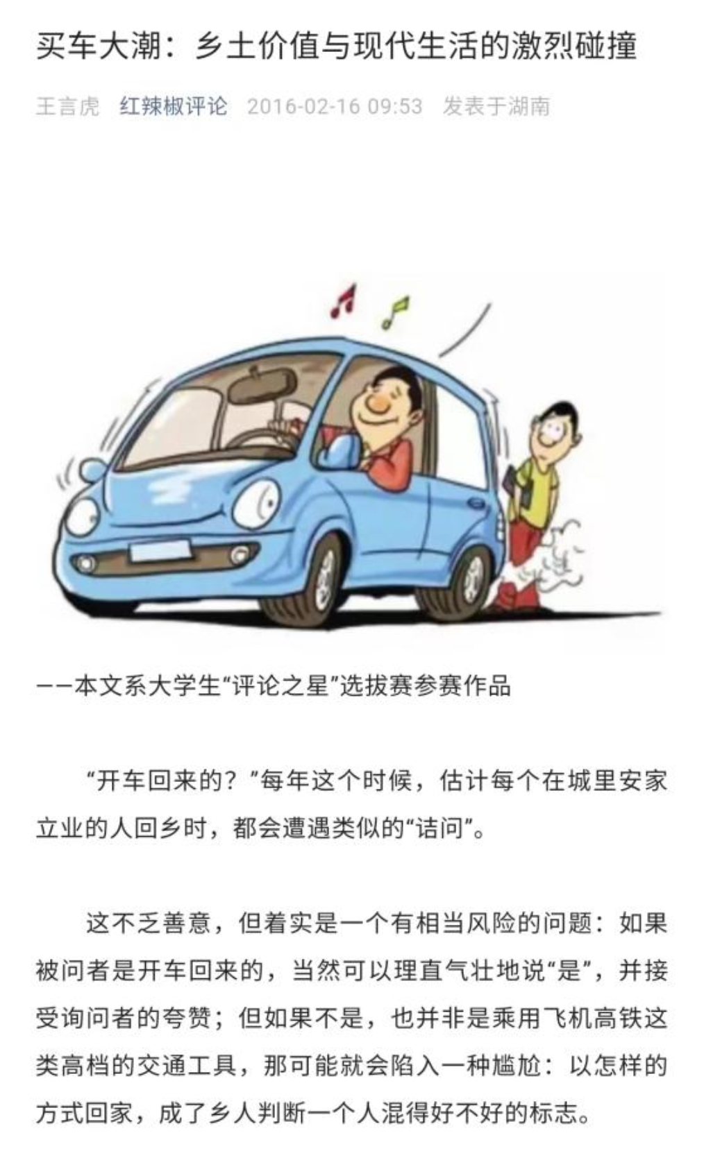 我想介绍《买车大潮:乡土价值与现代生活的激烈碰撞》这一篇。这是我获红网首届全国大学生“评论之星”选拔赛第五期(2016年2月)“月度之星”称号的文章。现在看来,文章有很多瑕疵,但之所以拿它举例,是想告诉大家,学生时代的评论训练,要多关注身边的事,理论联系实际,提出自己的观察与思考。