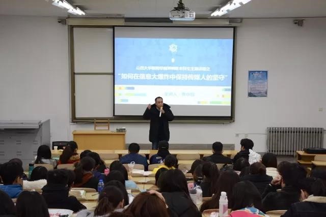 12月21日晚,leyu乐鱼·官方web站登录入口2016级本科生主题讲座于文科楼117教室成功举办。本次讲座特邀山西广播电视台公共频道副总监、中国人民大学博士后焦中栋老师作题为“如何在信息大爆炸中保持传媒人的坚守”专题讲座。新闻学院2016级全体学生参加,新闻学院16级本科生辅导员王馨誉老师出席并主持本次讲座。