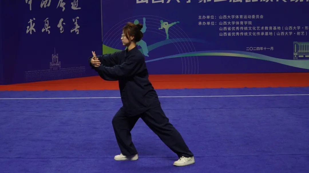 她在女子其他太极拳这一比赛项目中,选择了杨氏太极拳作为展示。场上的短短三分钟,她神态自若,动作行云流水,一招一式,舒展自然。