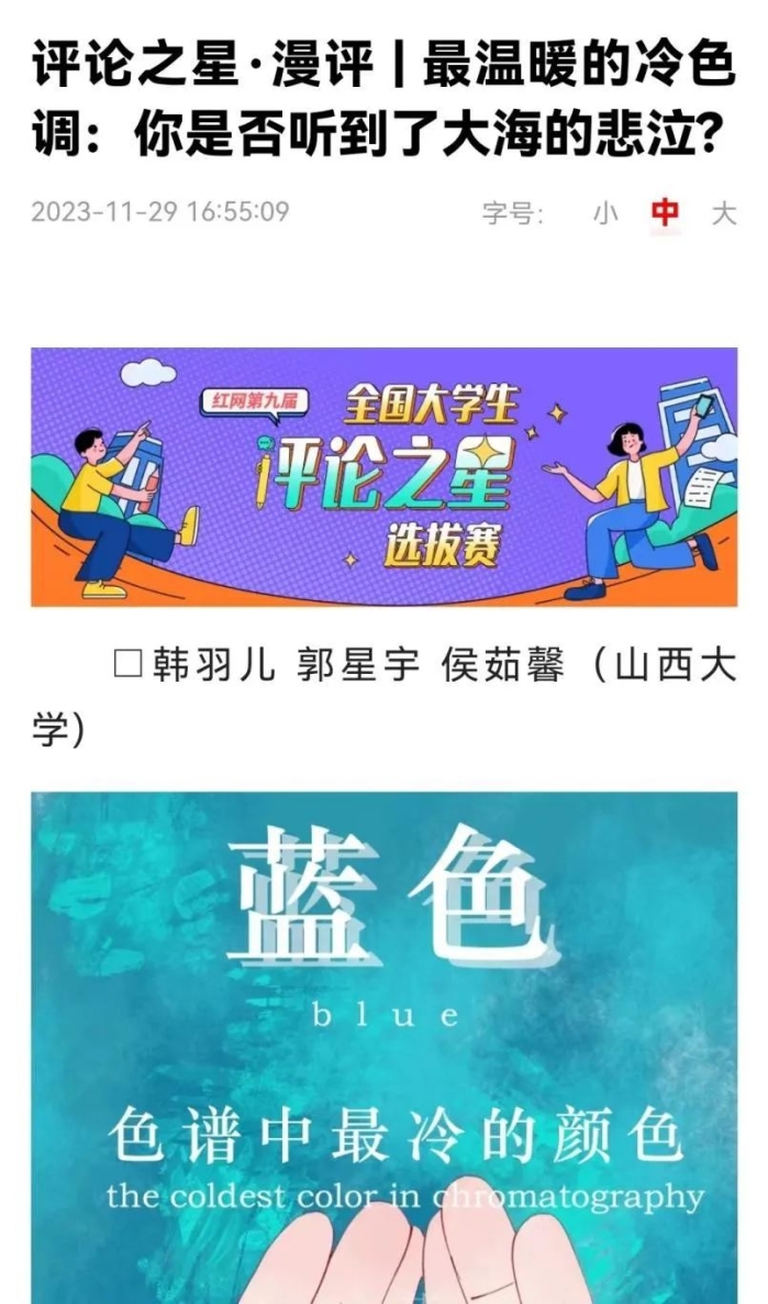 在获二等奖的漫画评论作品《最温暖的冷色调:你是否听到了大海的悲泣?》中,韩羽儿、郭星宇、侯茹馨同学从小切口引入海洋核污染话题,选择饱和度高的颜色抓住受众视线,和展现污染部分的灰色形成鲜明强烈对比,突出强调了色彩与情感。中国人民大学新闻学院副教授杨奇光老师评价:“以颜色为核心,表达对海洋污染问题的关注,充分利用漫画的视觉优势,作品质量高”。