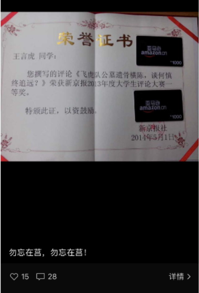 (图3:2014年新京报大学生评论大赛的一等奖证书,图为当时发的一则朋友圈)