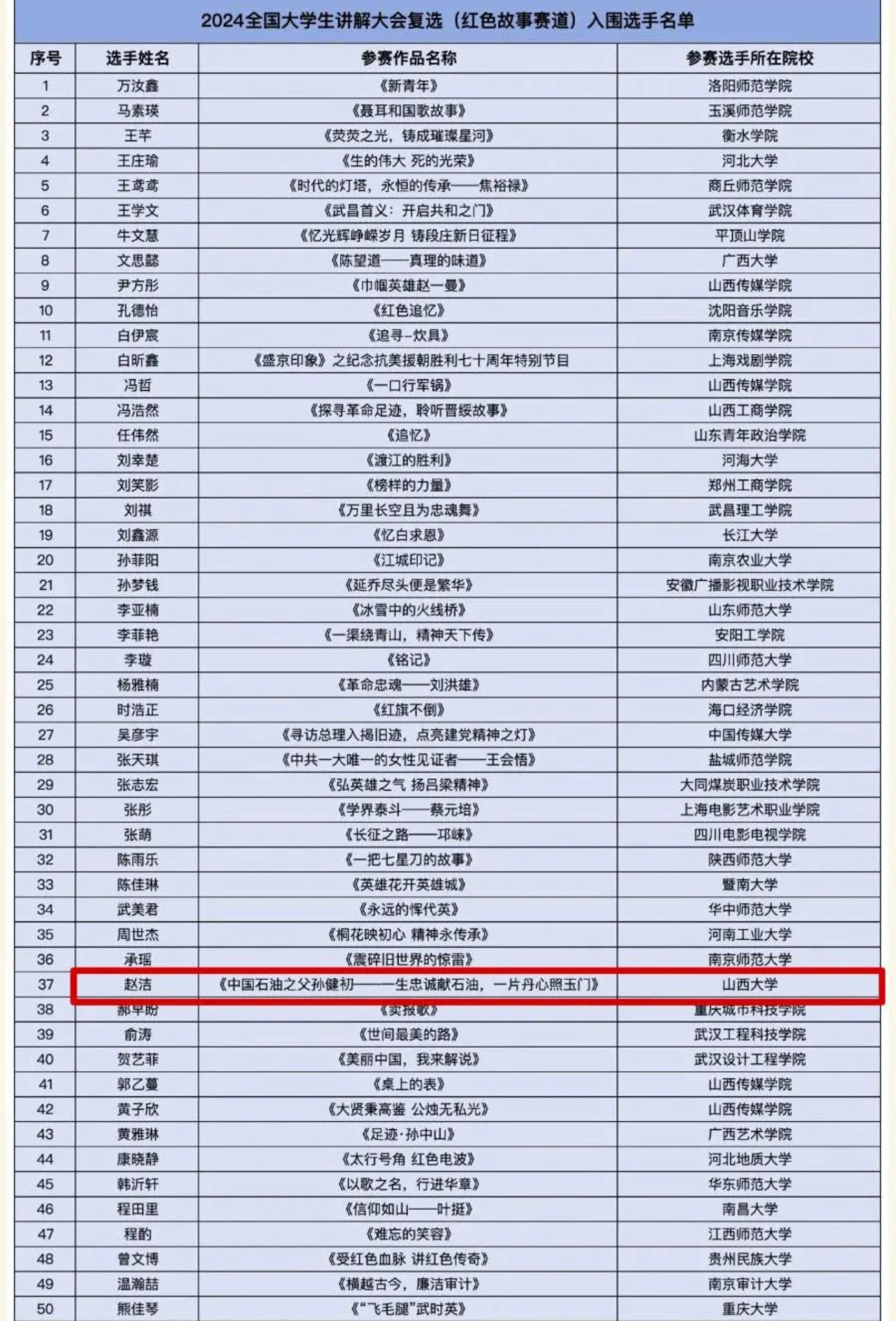 2024年全国大学生讲解大会复选(红色故事赛道)入围选手名单(图)
