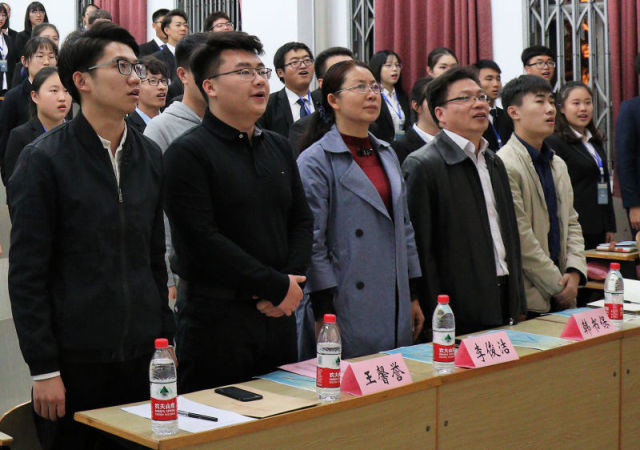 会议开始,全体参会人员起立奏唱中国共青团团歌。