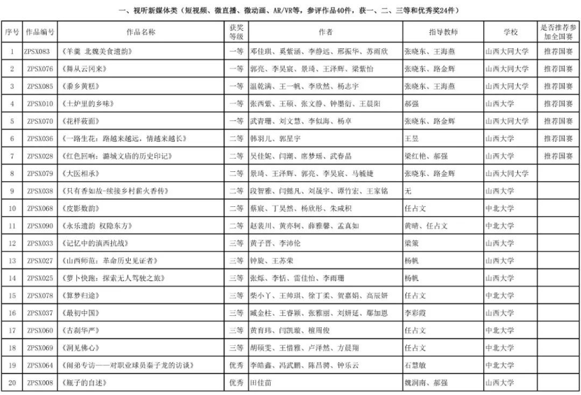 经山西分赛区办公室审核、专家评审,共有56部获奖作品脱颖而出,其中视频新媒体类24部、数据多媒体类31部、数字系统设计类1部,拟推荐参加全国赛总数17部,占总作品数比例18%。