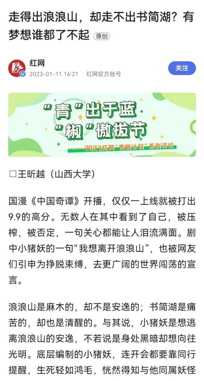 在获二等奖的文字评论作品《走得出浪浪山,却走不出书简湖?有梦想谁都了不起》中,王昕越同学针对《中国奇谭》爆火后许多网友面对现实桎梏的颓废心理,认为小人物也有大梦想,呼吁大家挣脱束缚,探索更广阔的世界。苏州大学传媒学院执行院长陈龙教授表示赞赏:“作者由《中国奇谭》这一作品联系现实,展开反思,该评论所把握的核心命题具有深刻的现实意义。文章思路清晰、行文流畅,文笔优雅,是一篇较好的评论文章。”