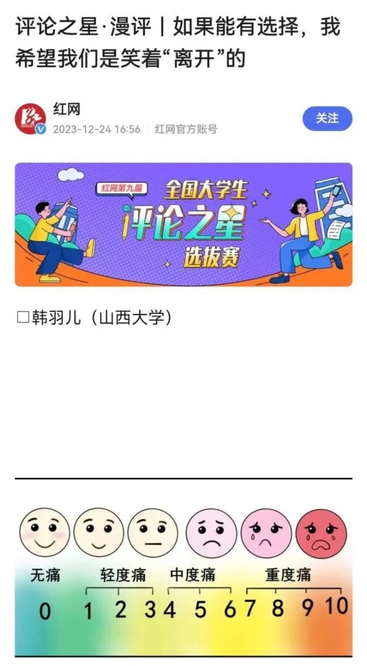 其中,韩羽儿同学获一等奖的漫画评论作品《如果能有选择,我希望我们是笑着“离开”的》聚焦“安宁医护”,用漫画的形式,以小见大地刻画出这一行业面临的困境。浙江大学求是特聘教授、博士生导师吴飞教授认为,该作品“画面有冲击力,视角的选择很巧妙”。中国经济体制改革研究会常务理事祝华新老师表示“字里行间有对生命尊严的思考和真诚维护”。国防大学政治学院王传宝教授也肯定了该作品的感染力,认为“有共情代入感”。