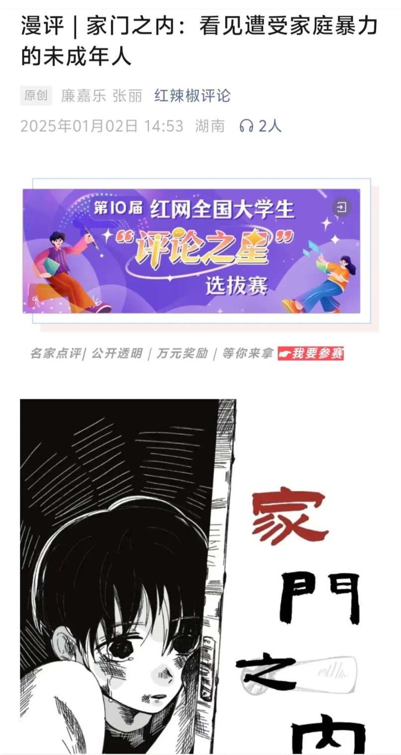 近日,红网第10届全国大学生“评论之星”选拔赛12月月赛榜单出炉。我院2021级本科生廉嘉乐(广告学)和张丽(新闻学)合作的漫画评论作品《家门之内:看见遭受家庭暴力的未成年人》获漫评组一等奖。