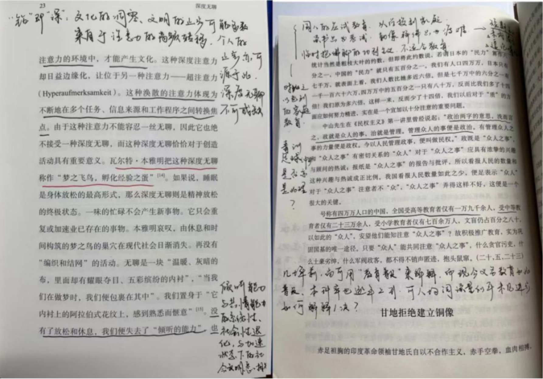 第一种是发散思维,即针对某句话延伸出思考内容,而不是仅仅围绕话题本身。有些书之所以值得反复读,恰恰就是为了捕捉到每一次延伸思考金句、案例后偶然迸出的火花。例如,韩炳哲《透明社会》的《展示社会》一章中有言“‘膜拜价值’取决于存在,而非展览”,多数人会直接想到“距离产生美”;还可联想至《蒙娜丽莎》被大量复刻印刷,甚至登上文化衫上,是否丧失灵韵;再联想到强调以“透明性”自救的新闻业,很难不担心过度公开采编流程是否会消解媒体的权威性,肢解受众的膜拜心理。这样,稍加发散,便能让短短一行黑字丰满多彩起来,再贴近自己的专业展开思考,可能就诞生一篇小论文。读书就是为了以思维代替赤足,帮自己远航,故而不必吝啬发散思考和无边际的精神漫游。02第二种是动态思维,这个思维是我在读曹操传记时学到的,彼时的阿瞒也是如此注解《孙子兵法》的。囿于年轻人的学术积累、阅历经验,我们无法在初次看书、初次笔记的时候就写下入木三分的见解。这要求笔记者及时记录下此刻所思所想、所伤所感后,留足书写空间,方便日后重读时更正、补充或延续原初笔记。这样一来,也可以进行纵向的历史记录,展现自己知识想法的有机成长过程。日后当作个人的思想简史来看,也是美事一桩。当然,每一次修订笔记时最好更换用笔颜色,以作区分。03第三种是形象思维,即以直观形象和表象为支柱的思维过程。具体说来,就是边读书边建构本书叙事说理的框架,明了各章所担纲的表述任务,清楚各节分饰的说理角色,拆解段句间的逻辑脉络和演进节奏。在此过程中,笔记者可以各显神通,擅于绘画的可于空白处素描一幅章节框架图,长于想象的可意会出一架具象模型帮助理解内容。以福柯的《疯癫与文明》为例,我们不妨假想DC宇宙下的哥谭市,是否像是病人们各怀鬼胎又同受压迫的疯人院,谈及“全景监狱”时不妨想象在黑暗的环形监狱上方,有只巨型眼睛,瞳孔凸出,眼白布满血丝。如此想象画面,不寒而栗之感会帮助你更好理解福柯那天马行空般的学究语言。